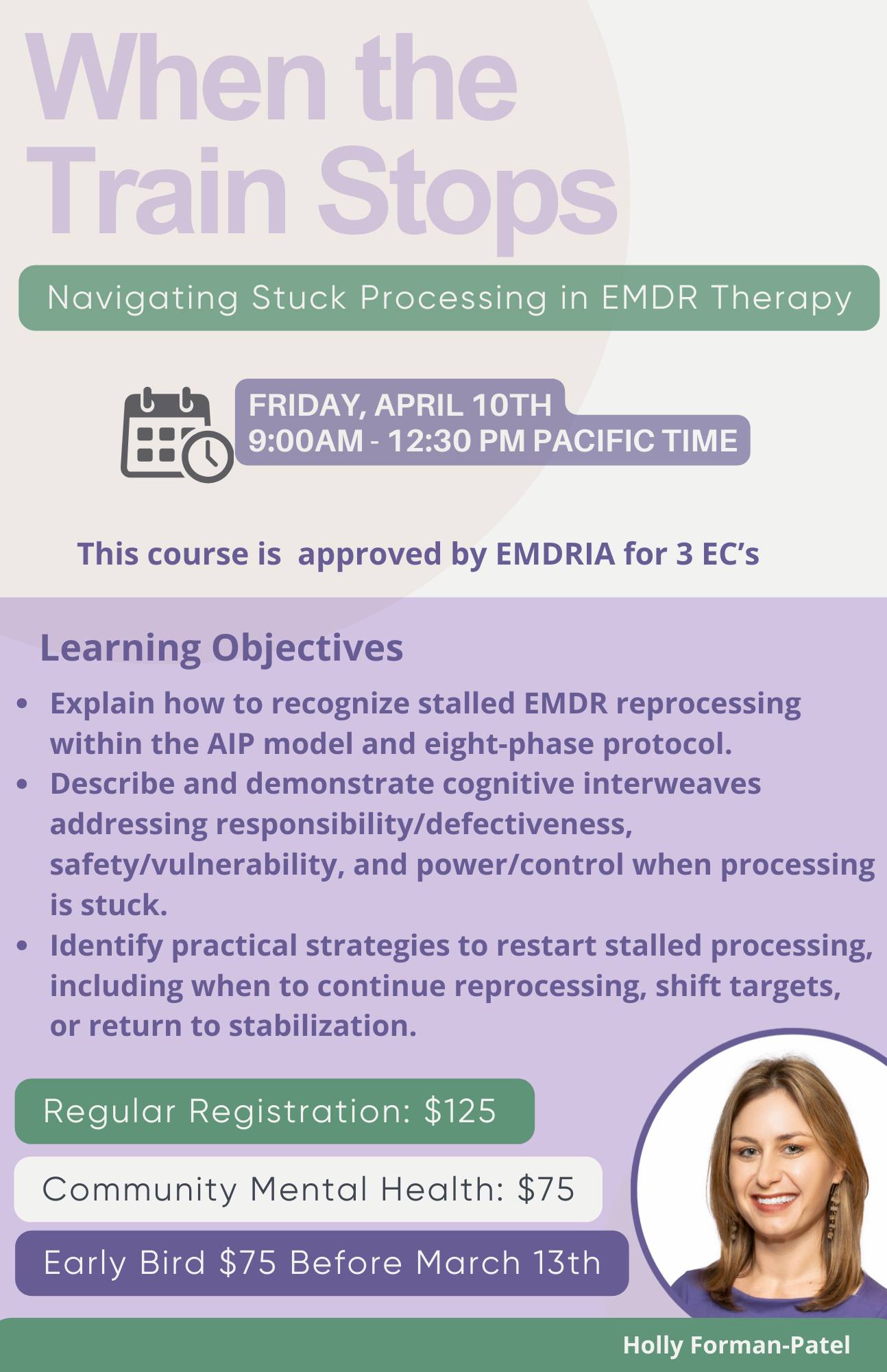 This 3 hour training (presented by Holly Forman-Patel) will equip participants with practical skills to effectively navigate stalled reprocessing in EMDR Therapy.